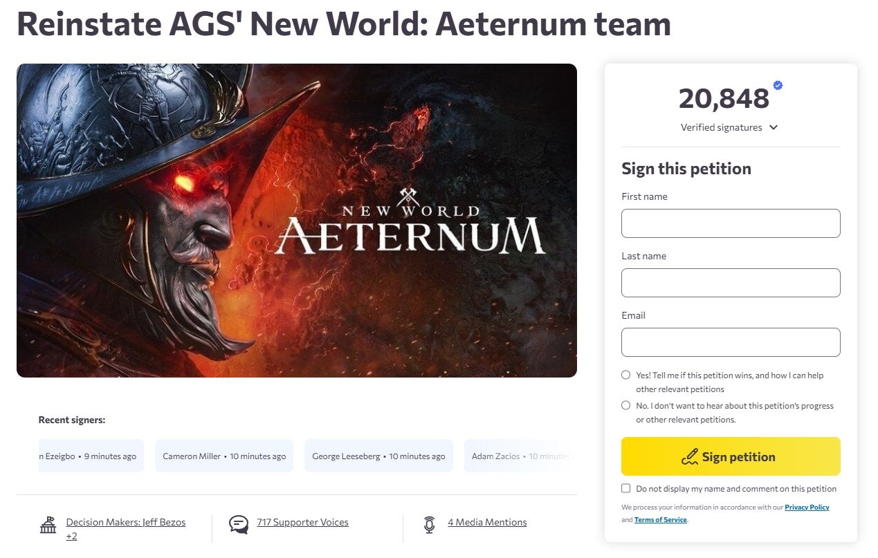 Ci jednak się nie poddają. Ruszyła już specjalna petycja, która ma wymusić, inaczej, poprosić Amazon o przywrócenie zespołu deweloperskiego i kontynuowanie prac nad grą. Czyli po prostu o uratowanie New World od rychłej śmierci.
