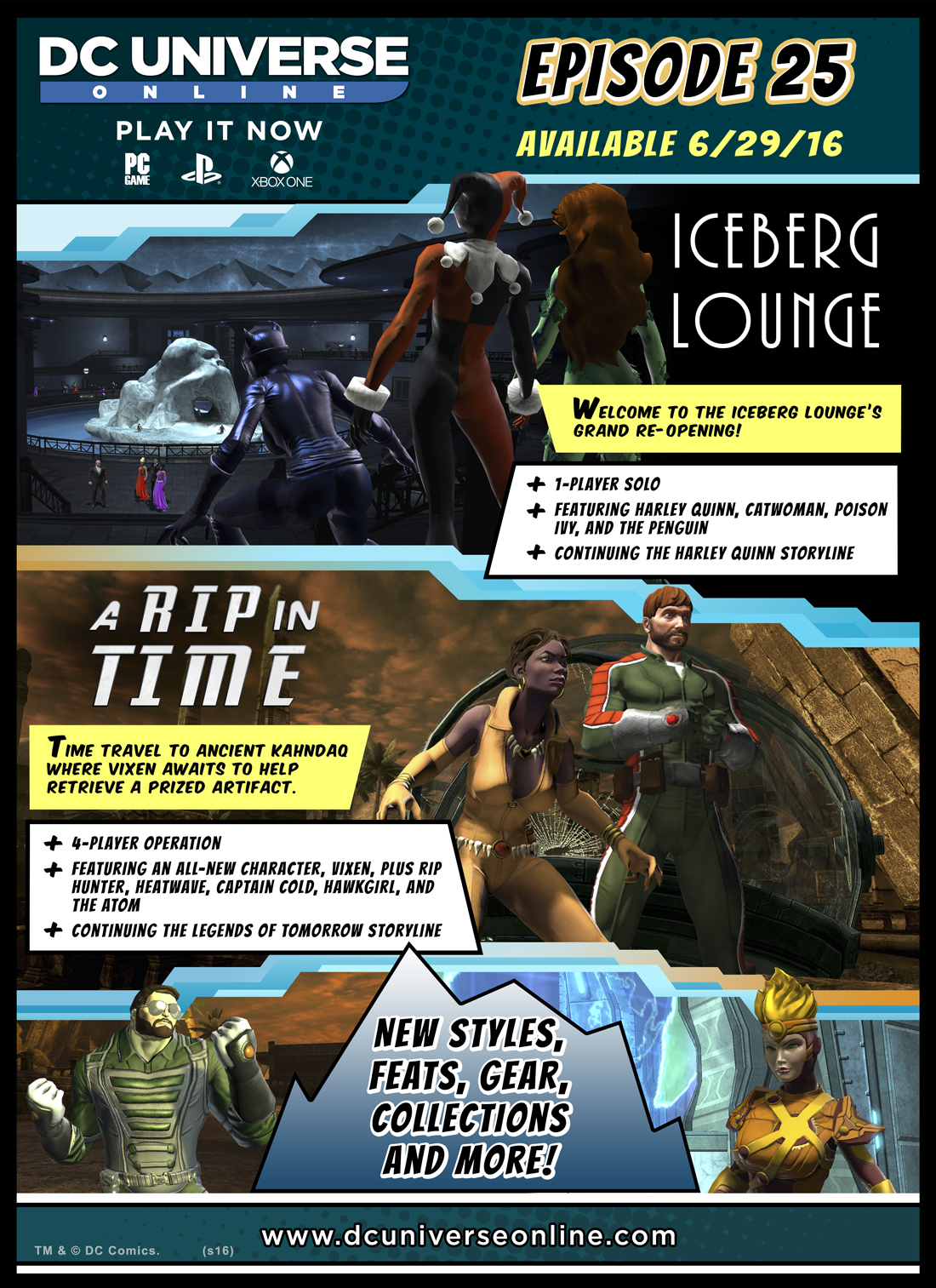 Na otwarcie przybędzie wiele czarnych charakterów, jak między innymi Trujący Bluszcz, czy Harley Quinn. Jest to wyyzwanie dla pojedynczego gracza, w postaci nowego Solo dostępnego od 30 poziomu. Wewnątrz znajdziemy nowe przedmioty, sprzęt i featy. Dla 4-osobowych grup przygotowano operację A Rip in Time, podczas której również mamy szansę na zdobycie ciekawych bonusów.