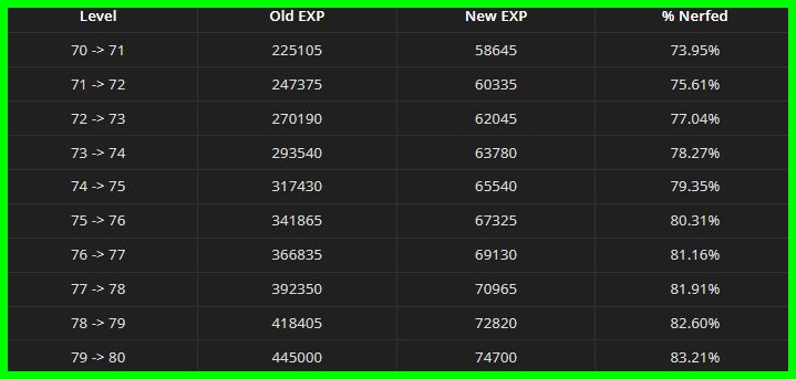 Levelowanie postaci między 70 a 80 poziomem zaliczyło spadek od 74% do 83% w dół. Oznacza to, że na niektóre poziomy wymagane jest ~80% expa niż wcześniej.