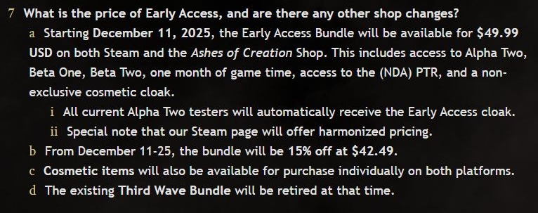 Dotychczasowy dostęp do Alpha Two Phase Three kosztuje - w oficjalnym sklepie gry - równe 100 dolarów. Wiele osób spekulowało więc, że podobna cena czeka nas również na Steamie, gdy Ashes of Creation wkroczy w fazę Early Access (premiera 11 grudnia).