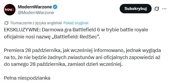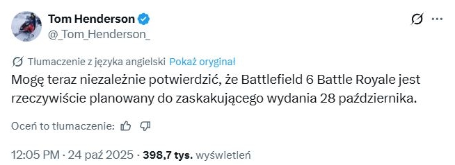 Ale jak donosi Tom Henderson, ModernWarzone oraz Insider Gaming (to mega wiarygodne źródła, które praktycznie się nie mylą), Battlefield 6 Battle Royale rzeczywiście ma się ukazać we wtorek, 28 października.