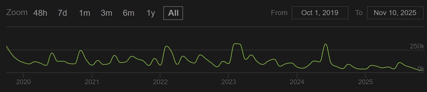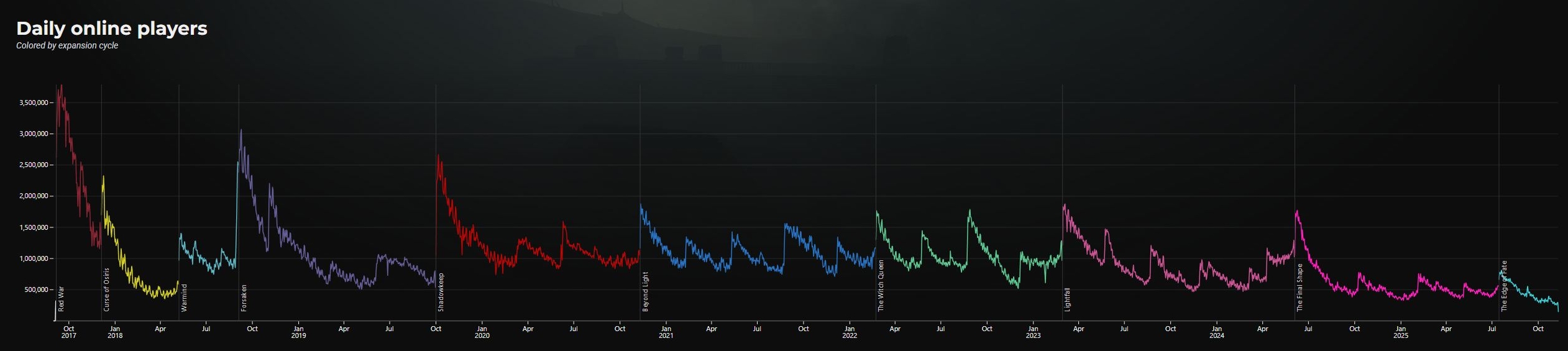 Dane ze Steama potwierdza ten wykres, który zbiera wyniki API aktywności graczy za rajdy, dungeony, PvP (itd.). Widzimy dokładnie, że październik czy w ogóle - ostatnie miesiące - były dla Destiny 2 najgorszym okresem.