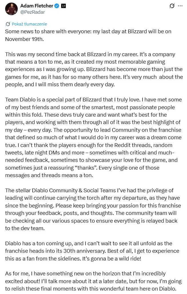 Ale na tym koniec. W przyszłym tygodniu Pan Fletcher opuszcza zespół Diablo 4 i opuszcza Blizzard Entertainment (czyli to nie jest „przeniesienie” do innego projektu „Zamieci”, ale całkowite pożegnanie z firmą).