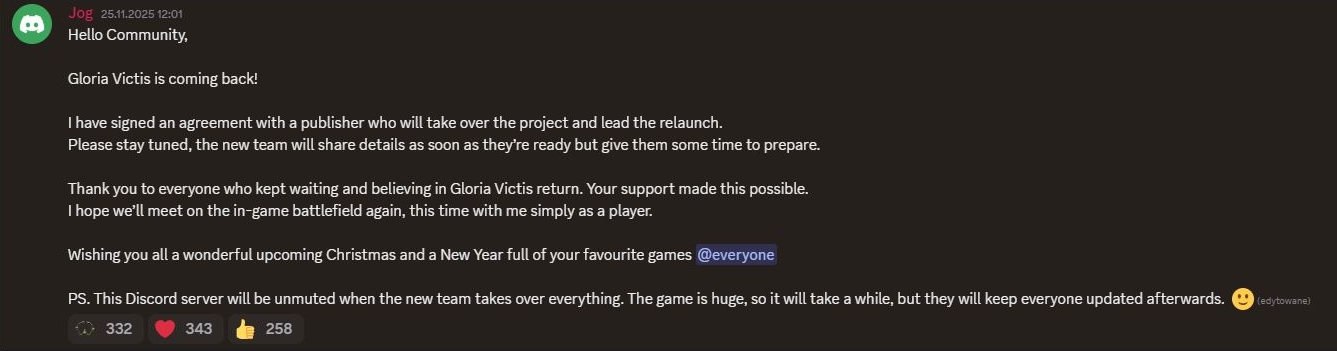 Bądźcie czujni, nowy zespół podzieli się szczegółami, gdy tylko będą gotowe, ale dajcie im trochę czasu na przygotowania.Dziękuję wszystkim, którzy czekali i wierzyli w powrót Glorii Victis. Dzięki Waszemu wsparciu to było możliwe. Mam nadzieję, że spotkamy się ponownie na polu bitwy w grze.