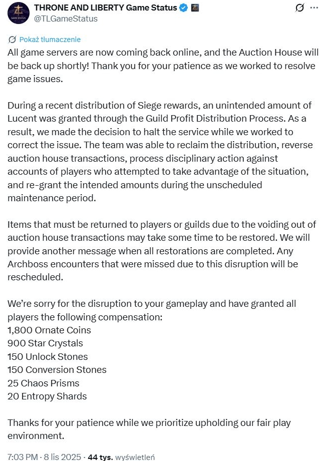 Dopiero zmasowane „tickety” od graczy TL, którzy zauważyli, że coś niedobrego dzieje się na rynku Throne and Liberty, zwróciły uwagę Amazon Games, które najpierw wyłączyło Dom Aukcyjny, a potem na wiele godzin wyłączyło całą grę. Sytuacja była więc bardzo poważna.