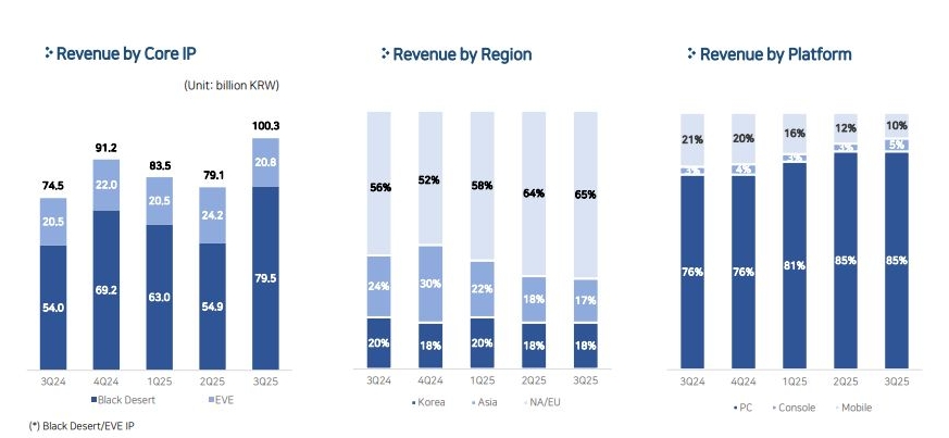 W ujęciu regionalnym, udział Black Desert w przychodach wynosił 65% dla Ameryki Północnej i Europy, 18% dla Korei i 17% dla Azji. W ujęciu platformowym, 85% dla komputerów PC, 10% dla urządzeń mobilnych i 5% dla konsol.