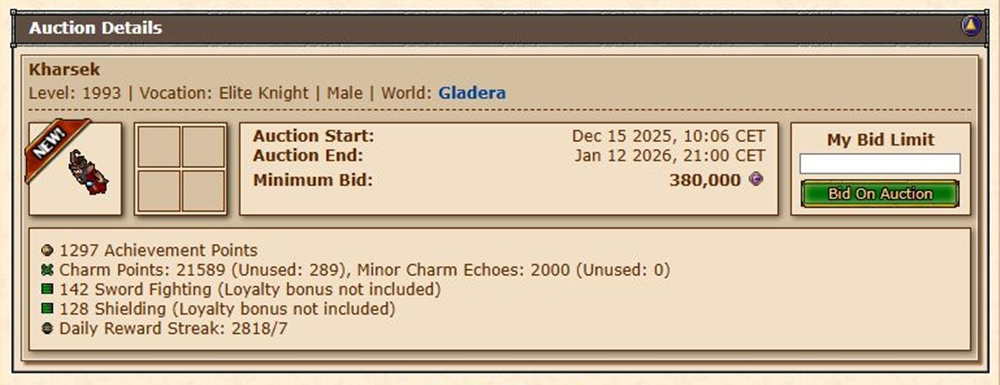 Aukcja postaci potrwa do 15 stycznia. 380,000 Tibia Coins to cena minimalna/wyjściowa, więc ostateczna kwota może być jeszcze wyższa.