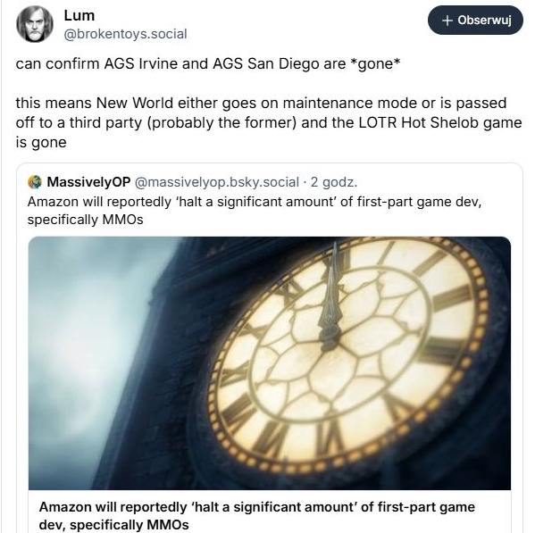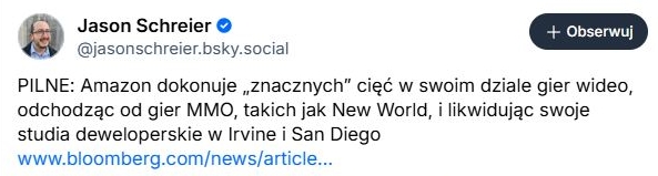 Komunikat Amazon jest bardzo „bezpieczny”, ale Bloomberg w swoim raporcie wali już prosto z mostu. Amazon poległ na grach MMO - poza początkowym sukcesem New World - i podobno nie ma zamiaru dalej w to brnąć.
