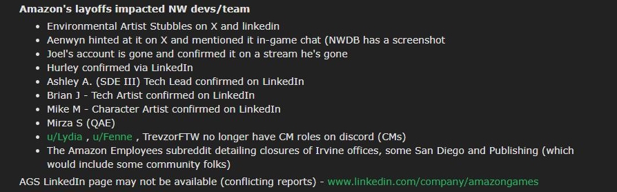TUTAJ znajduje się zbiorczy temat fanów New World o zwolnieniach. Potwierdzono już, że wiele kluczowych osób z działów technicznych NW pożegnało się z pracą. Tak samo niektórzy Community Managerowie. A lista cały czas się wydłuża. Zniknął też profil AGS na Linkedin.
