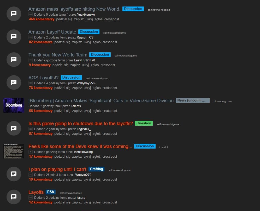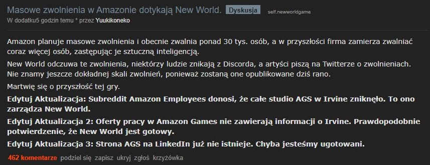 Jak dowiadujemy się z Subreddita New World, subreddita AmazonEmployees, wpisów na Discord oraz profilów na Linkedin - odziały deweloperskie Amazon Games Studios w Irvine oraz San Diego, który odpowiadały za New World, przepadły.