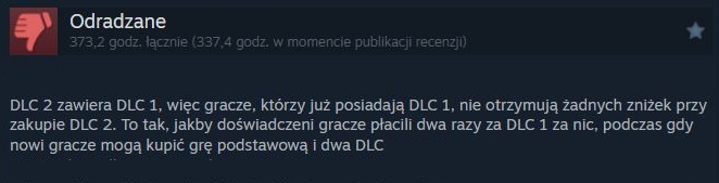 DLC 2 zawiera DLC 1, więc gracze, którzy już posiadają DLC 1, nie otrzymują żadnych zniżek przy zakupie DLC 2. To tak, jakby doświadczeni gracze płacili dwa razy za DLC 1 za nic, podczas gdy nowi gracze mogą kupić grę dwa dlc w cenie jednego.