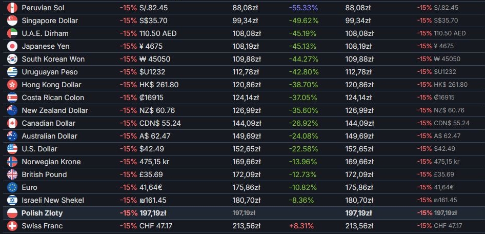 Od 2022 roku Valve nie zaktualizowało cen regionalnych dla Polski, co niestety - w wielu przypadkach - prowadzi do absolutnej patologii na Steamie. Za gry płacimy prawie najwięcej na świecie, dużo więcej niż (bogatsi) Amerykanie i (bogatsi) mieszkańcy strefy euro z Europy Zachodniej.