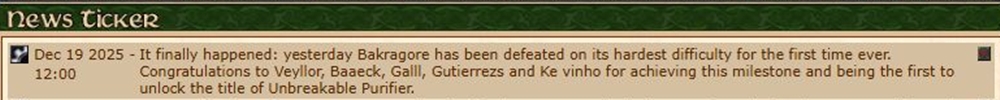 Aż do teraz, gdy piątka doświadczonych i (bardzo) wysokopoziomowych postaci z Brazylii dopięła swego i pokonała Bakragore na najwyższym poziomie trudności. Poprawka: nie tyle wysokopoziomowych, co czołowych playerów całej Tibii - w zwycięskiej grupie był m.in. „Veyllor” - 2886 lvl, TOP1 Paladyn, TOP4 gracz na świecie. To kolejny dowód na to, że gracze z niższymi poziomami raczej nie mają czego szukać w takim starciu z Bakragore.