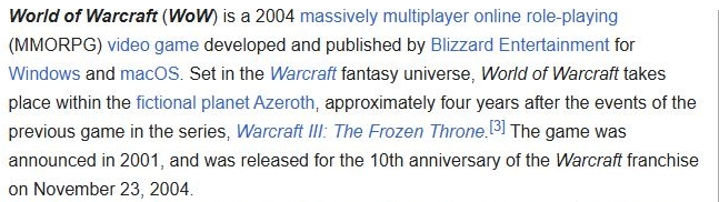 23 listopad 2004 roku WoW wkroczył na rynek, zmieniając cały gatunek MMORPG. A najlepsze (albo najgorsze) jest w tym wszystkim to, że do tej pory nie powstał większy, bardziej medialny, bardziej popularny tytuł Massively Multiplayer Online od World of Warcraft.
