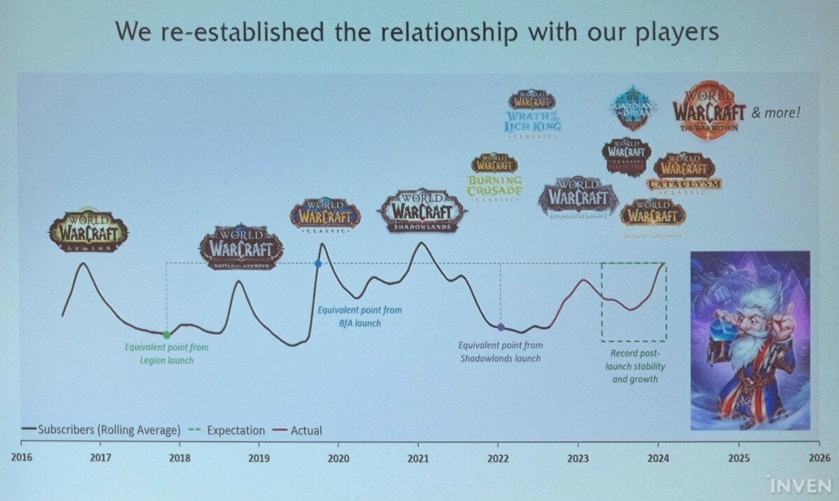 Podczas GDC 2024, jeden z deweloperów WoW-a pokazał poniższą grafikę. Oszacowano potem, że WoW miał wówczas około 7,2 mln abonentów.